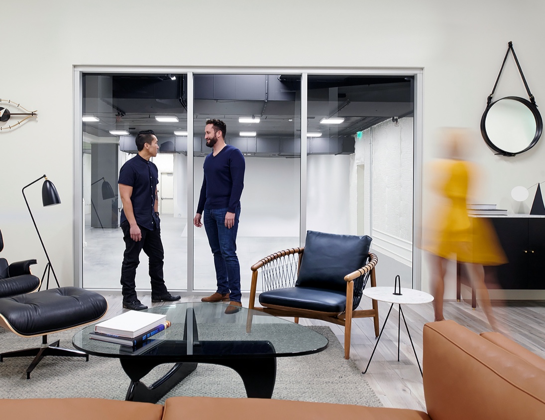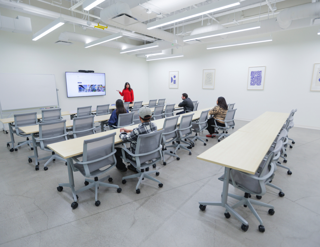 In search of your next meeting space? Look no further than the Flex Space at One Culver. With modular furniture that easily flexes between a variety of configurations, and a kitchenette complete with Smeg appliances, the Flex Space can easily accommodate meetings of all types.